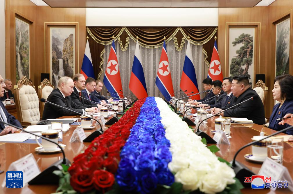 6月19日,在朝鮮平壤,朝鮮勞動(dòng)黨總書(shū)記、國(guó)務(wù)委員長(zhǎng)金正恩與俄羅斯總統(tǒng)普京舉行會(huì)談。